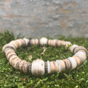 Le bracelet élastique Jo est confectionné à partir de rondelles de coco et de perles en corne.