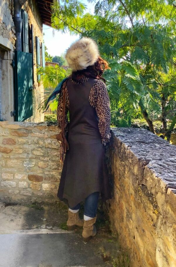 Gilet long sans manches en cuir marron / noir avec fermeture pressions.